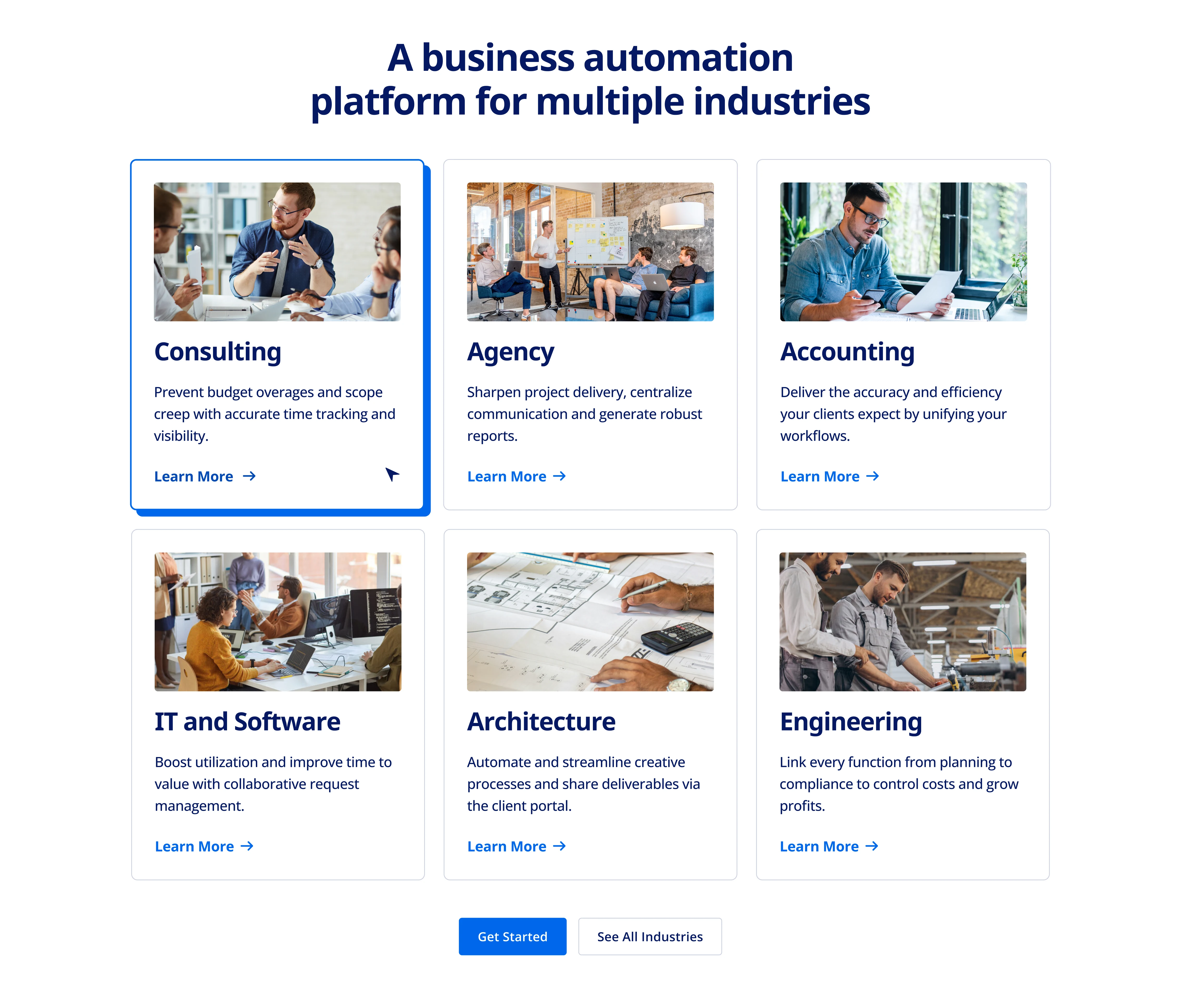 Starting with the homepage, I focused on defining the look and feel, using the hero landing section to set the tone. The goal was to create a site that was approachable, friendly and clearly communicated the benefits of using Accelo. I conducted competitor analysis and gathered quick concepts to facilitate the conversation with the marketing team and CEO and find alignment on the new direction.