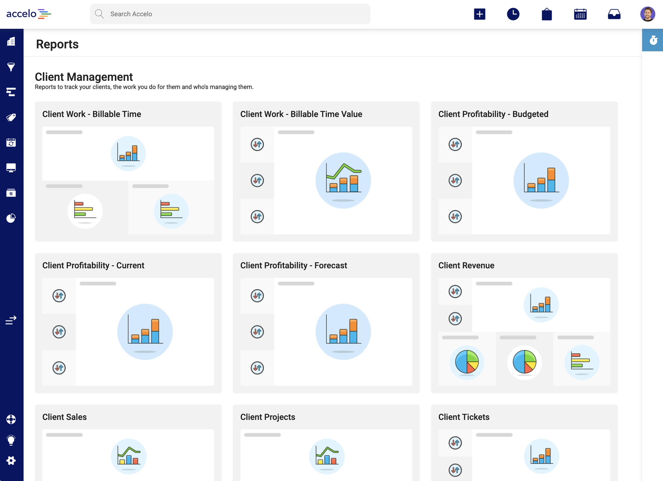 The existing Accelo Reporting page posed significant usability challenges. The images didn't represent the data and there was no way to filter or access frequently used reports. This presented a prime opportunity to enhance this heavily utilised area and improve user experience.