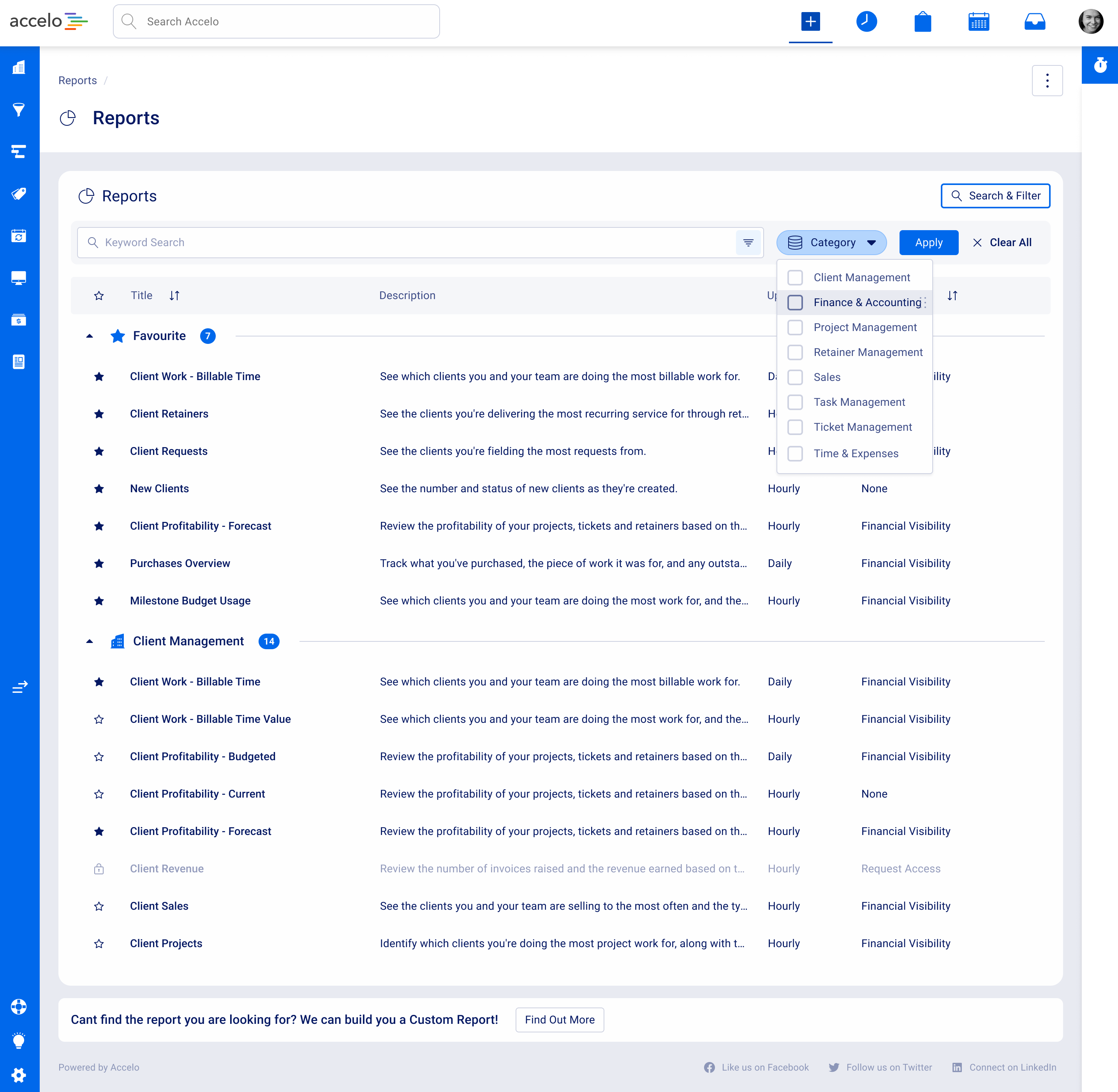 The Accelo Product team aimed to identify high-impact areas for improvement that required minimal development effort. I suggested focusing on the Reporting page, a highly popular feature with around 75 individual reports across 8 segments. The Reports section, designed over 3 years ago, needed a refresh. Using components from the new Accelo Design System, I was confident I could swiftly enhance the reporting experience for customers.